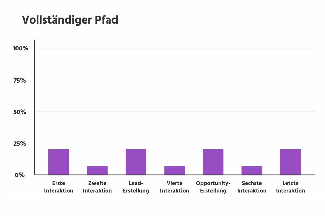 Die Full-Path-Attribution baut auf dem W-förmigen Modell auf, schliesst aber noch den Kauf mit ein. Grundsätzlich werden die wichtigsten Meilensteine der Customer Journey am stärksten gewichtet, die dazwischen liegenden Berührungspunkte werden jedoch weniger stark gewichtet. Einer der grössten Vorteile dieses Modells besteht darin, dass es die Interaktionen des Salesteams nach der Erstellung einer Opportunity berücksichtigt und ihnen das gleiche Gewicht wie den Marketingaktivitäten in der Anfangsphase einräumt.